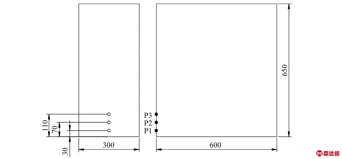 试验中在矩形液舱长度方向左侧舱壁中心线上安装三支微型数字压力传感器,离液舱底部的距离分别为30 mm,70 mm,110 mm,三支压力传感器从液舱底部至自由液面依次被命名为P1,P2,P3,如图3所示。试验过程中通过布置摄像机对液体晃荡自由液面形状进行记录。每次试验前,均对运动平台,控制系统,压力传感器、位移传感器等进行检查以确保试验结果的真实可靠。