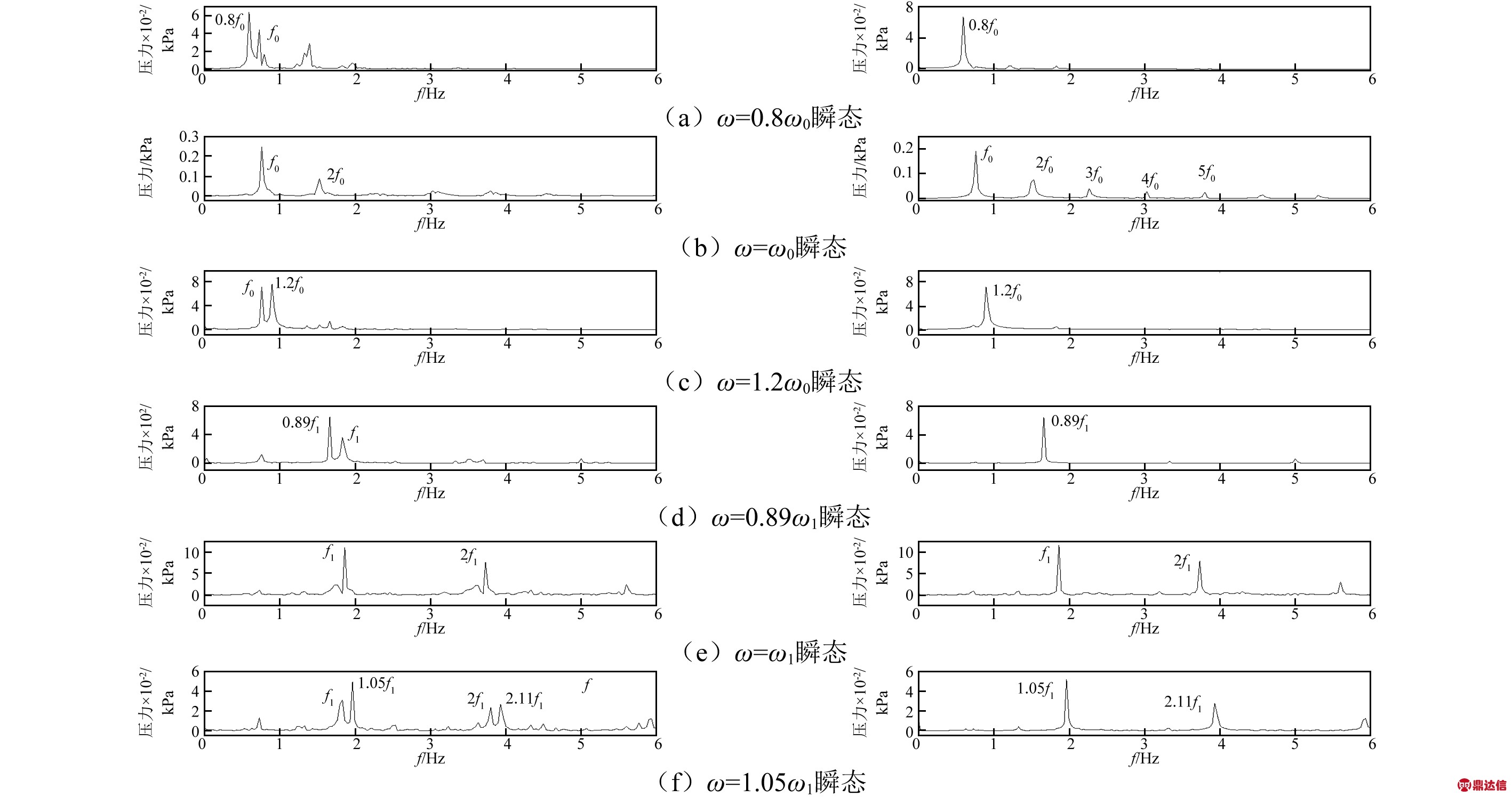 为研究液体晃荡过程中不同模态之间的非线性相互作用及晃荡波的时间演化特征,基于快速傅里叶变换(Fast Fourier Transform ,FFT),获得了一阶模态和二阶模态附近的压力时程曲线的频域结果,如图9所示,其中振幅为7 mm,外激励频率依次为0.6ω0,0.8ω0,ω0,0.89ω1,ω1,1.05ω1。需要说明的是上述用于FFT分析的压力曲线时间段为瞬态前30 s以及稳态150~180 s,用于对比一定外激励频率下瞬态与稳态压力曲线中的主要频率组成成分。