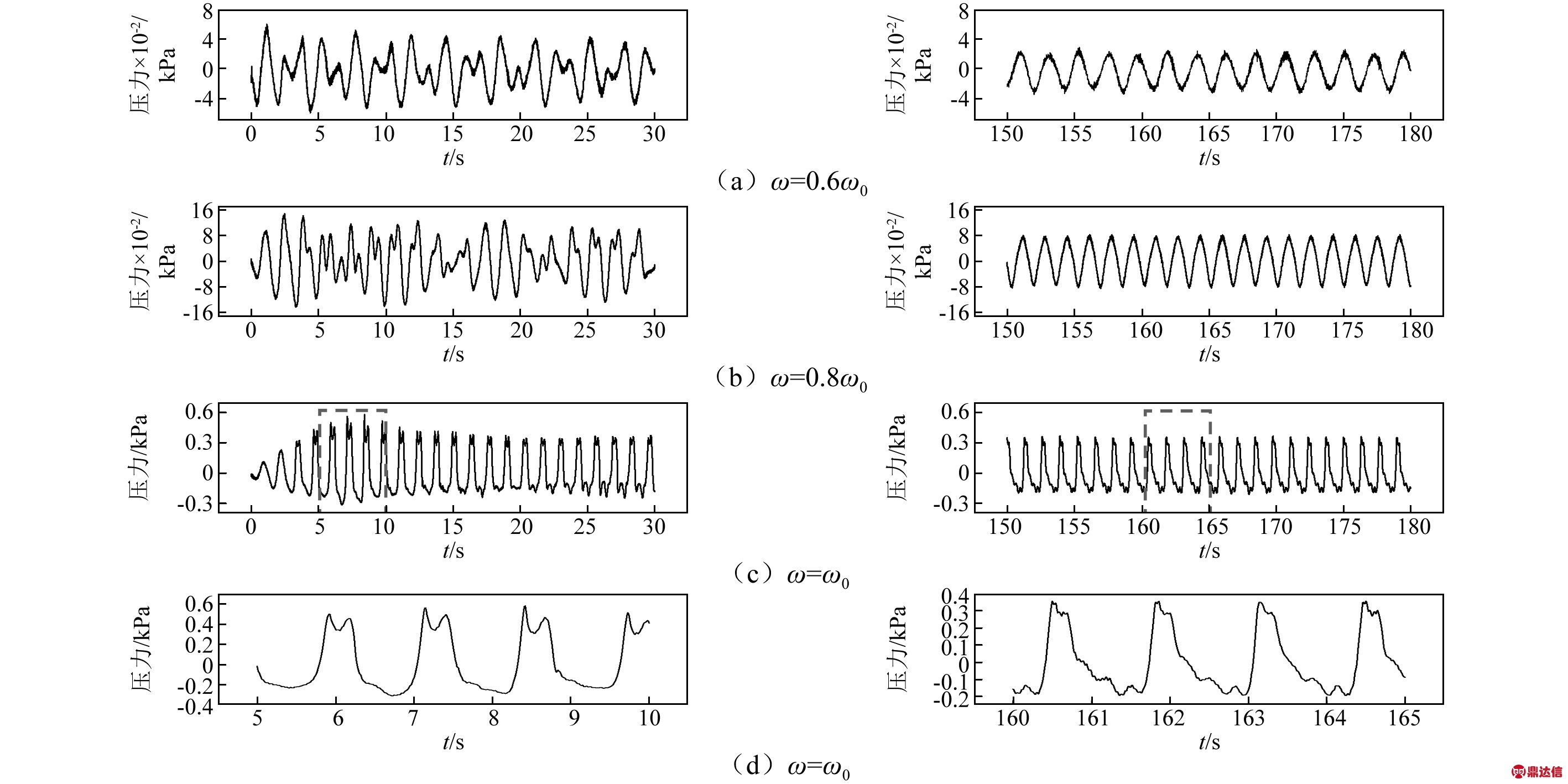 (2) 波浪破碎时的强非线性相互作用,会导致实测压力的第一极值出现在稍大于一阶理论固有频率的1.06ω0处,第二极值出现在稍小于二阶理论固有频率的0.98ω1处,并且第一压力极值的幅度大于第二压力极值的幅度。
