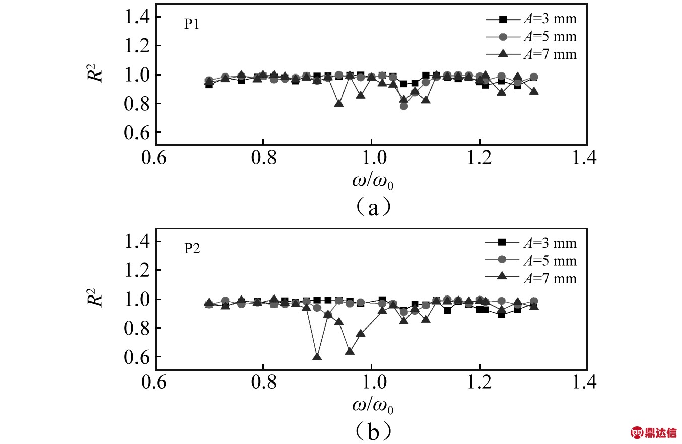 图4 相同试验条件下两组压力时程曲线的决定系数随外激励频率及运动幅度的变化规律