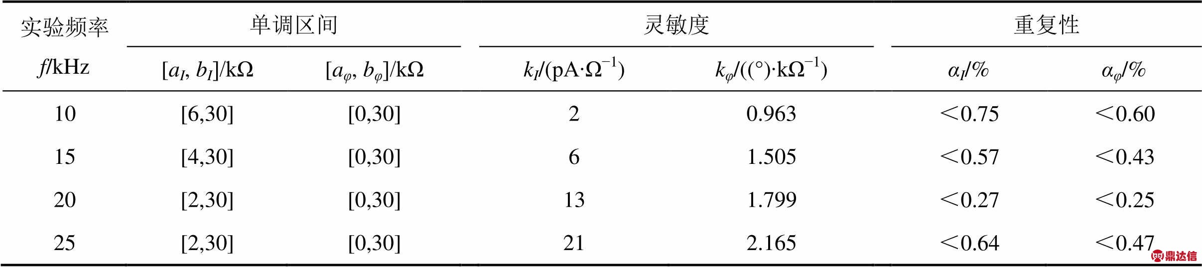 分别在激励频率f为10,15,20和25 kHz的条件下进行信号采集实验。在每个激励频率下,调节电阻箱电阻(参考电阻)Rc,从0至30 kΩ每隔2 kΩ作为1个测量点,每个测量点重复测量50次,每次采样数为15 000(用时t=10 000/fs=0.06 s),求得信号i的有效值I(取平均值)及其标准差σI和平均相位φ(取平均值)及其标准差σφ,测量结果如图8所示。对测量结果进行单调性、灵敏度和重复性分析,结果如表2所示。