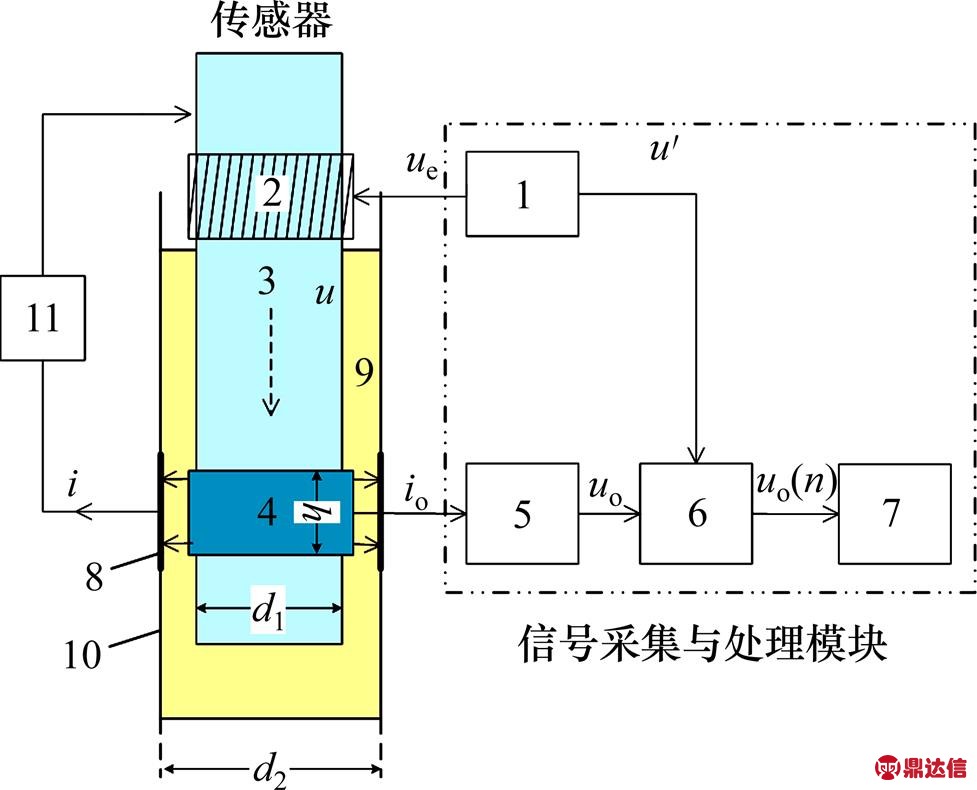 1—信号发生器;2—激励线圈;3—钢管;4—检测电极;5—放大电路;6—数据采集仪;7—计算机;8—锡箔纸;9—柴油;10—绝缘桶;11—交流电阻箱。