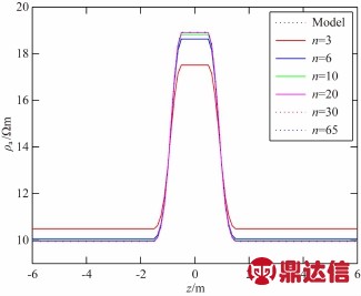 图8 中曲线model为利用公式(21)、(22)计算的结果,表示非封闭扇环柱形裂缝的测井响应,其中θ=130°,标号为n=4,6,9,18,36,60的曲线表示当多边形棱柱壳横截面的边数分别为3,6,10,20,30,65时计算的测井响应,与图7相比虽存在较大差别,这说明高阻流体对套管封闭程度(θ大小)对过套管电阻率测井是有重要影响的,但其变化特点与图7是有类似之处的,这个算例再次说明用垂直裂缝组合逼近非封闭扇环柱形裂缝也是可以回归到非封闭扇环柱形裂缝的测井响应的,进一步验证了方法本身的可靠性.
