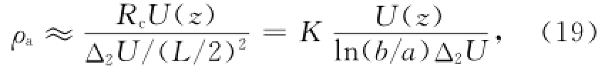 该式可用于测量和计算地层视电阻率,a,b分别为柱状地层的内外半径.公式(18)中含有电势二阶导数,在实际测量计算时是利用二阶差商近似代替公式(18)中的二阶导数,即