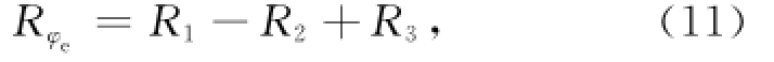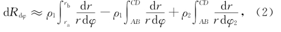 (2)式第一项是在dφ角内,地层无裂缝时单位高度扇环柱体的电阻,ρ1为地层电阻率,ρ2为裂缝内流体的电阻率.利用该式在φ=-φe~φe内扇环柱体的电阻可写为