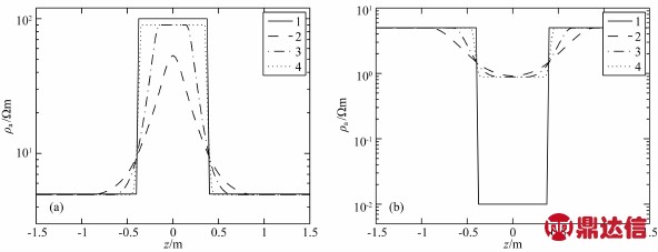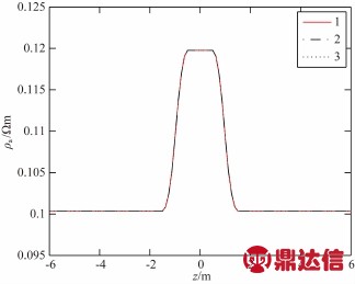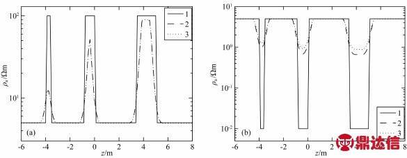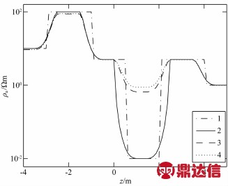 过套管电阻率测井仪器为三电极系测井仪,从算例图9—15电极距均取L=1.0 m,供电电流I0= 6 A,套管电阻率为ρc=2×10-7Ωm,套管半径a= 0.1 m,套管厚度Δa=0.00772 m.在图9—13中曲线1均为地层模型电阻率.