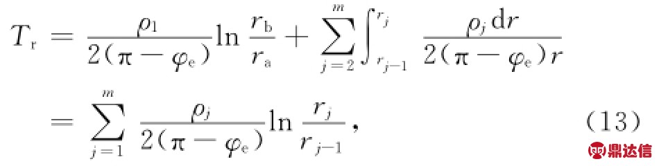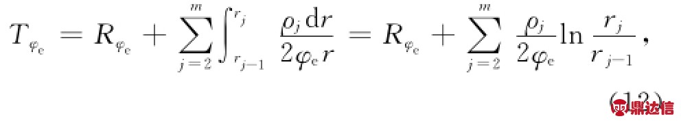 其中R3=1/S3.若地层在径向上是由m层同轴的柱体组成,设裂缝在径向的第一层,则在(-φe,φe)内的扇形区内单位长度套管的横向电阻Tφe为