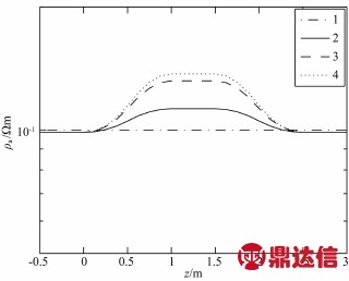 图11为地层裂缝中含不同流体时的测井响应曲线,曲线2、3、4分别对应地层裂缝中流体电阻率取ρf=10,100,1000Ωm时的测井视电阻率曲线(δr=0.005,H=0.11 m).曲线表明随地层裂缝中流体电阻率的增大视电阻率变大,测井响应明显.
