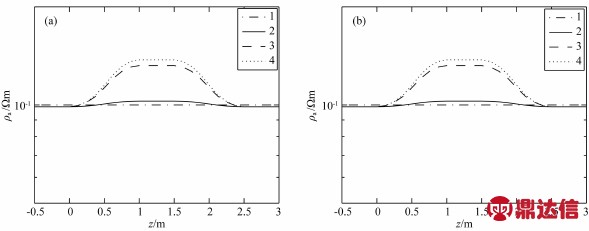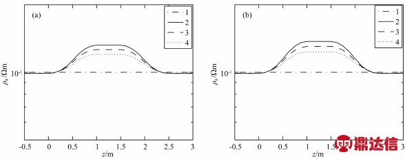 图10给出了裂缝张开度对地层过套管电阻率测井响应影响的计算结果,计算时假设地层是均匀的,电阻率为0.1Ωm(图10—12均取该值),在z= 0.5~2.0 m之间含有一高阻平面裂缝,H=0.11 m.曲线2、3、4分别为当裂缝张开度δr=0.001,0.005,0.01 m时裂缝的过套管电阻率测井响应曲线.图10a裂缝中流体的电阻率ρf=100Ωm,图10b裂缝中流体电阻率ρf=1000Ωm.该图显示:大张开度裂缝对视电阻率曲线影响较大,当裂缝中流体电阻率较大时,不同张开度的视电阻率曲线差别变小.