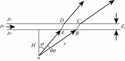 由于金属套管与地层电阻率的巨大差别使过套管电阻率测井响应的计算受到了很大的限制,目前有限差分和有限元法很少被用于过套管电阻率测井响应的计算(高杰等,2008;刘福平等,2007,2011,2013).传输线方程能很好地解决金属套管与地层电阻率的巨大差别这一问题(高杰等,2006,2008;刘福平等,2007,2011).因此寻找适合于传输线方程的过套管电阻率测井响应计算方法是目前解决裂缝计算问题的关键,下面首先研究含裂缝地层横向电阻的计算方法.当地层变化时,在传输线方程中则表现为横向电阻的变化.若地层存在裂缝,则裂隙会被油气等高阻流体填充,最常见的裂缝多为平面状的,如图1(含裂缝地层截面图).为方便计算横向电阻设地层为柱壳状,裂缝的平面平行于井轴,其中δr为地层裂缝的张开度(裂缝宽度),ra、rb为柱状地层的内外半径,H为裂缝到套管轴线O的距离,φe为裂缝一端(截面图)对套管轴线的张角.这类问题给利用传输线方法计算地层视电阻率带来一定的困难,下面利用电流通量管模型给出地层横向电阻的计算方法.在柱坐标系中选一扇形柱状体,其高为单位长度,在垂直于套管的截面上选两条电流密度线,如图2的OA和OB,电流发射角为dφ.由这个单位高度扇状柱体的上、下底面及φ=φ和φ=φ+dφ两个侧面上的电流密度线构成一个电流通量管,通量管沿径向向外无限伸展.通量管与电流密度线(电场线)平行,流过通量管任意截面上的电流是一个常数.当介质变化时,在两介质的界面电流密度线存在折点,电流通量管弯曲(如图2的地层裂缝截面AB、CD平面,ρ1为地层电阻率,ρf为地层裂缝中流体的电阻率).