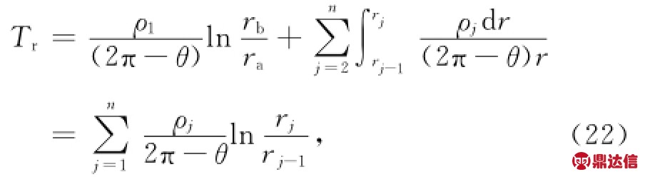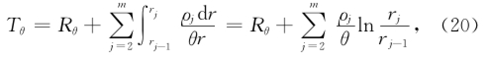 其中,rj为地层径向界面半径,j为地层编号,ρj为径向第j层地层的电阻率,Rθ为扇环柱形裂缝中流体的径向电阻,而ρf为高阻流体的电阻率,ra为高阻流体裂缝内径,rf为高阻流体扇环外半径.在(θ,2π)的扇形区内地层(不含裂缝)单位长度套管所对应的横向电阻Tr为