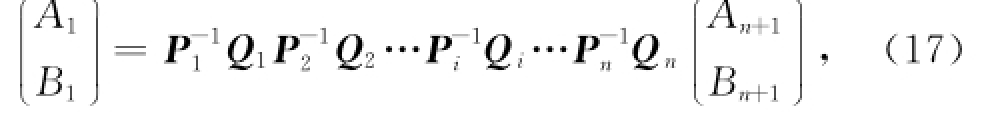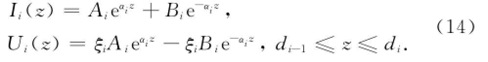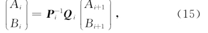 其中Ai、Bi为待定系数,ξi=Tfiαi.由第i、i+1层边界电流和电势连续条件得系数关系(刘福平等,2007,2011):
