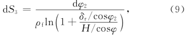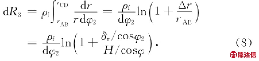 (2)式第三项是当该微分扇环柱体裂缝内充满电阻率为ρf的导电介质时的横向电阻,此时电流线在裂缝界面存在折点,如图4,其大小为d R3的导纳形式为