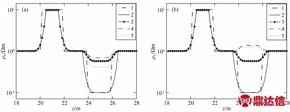 图13 与图9类似,为一5层状地层,ρi=1,100,1,0.01,1Ωm,i=1,2,…,5,但图13的第2层和第4层水泥与套管胶结不好,两者之间存在0.001 m的空隙,并被高阻流体填充,形成一层高阻流体柱壳(其参数取值与图9相同).曲线2、3、4、5分别对应只存在原状地层、有水泥环(无高阻流体)、有水泥环并存在高阻流体、有高阻流体(无水泥环)时地层模型的视电阻率曲线(环形裂缝厚度均为0.001 m).图13a高阻流体的电阻率为ρf=100Ωm,图13b高阻流体的电阻率为ρf=1000Ωm.同样低阻水泥环及高阻流体(厚度较小)对高阻地层测井曲线影响非常小(算例的第2层(z=20~22 m)曲线2、3、4、5无法区分);高阻水泥环及高阻流体柱壳对低阻地层测井曲线有较大影响(算例的第4层(z=24~26 m)).尽管高阻流体柱壳的厚度仅有0.001 m,但曲线存在非常大的差别(图13b的曲线4).比较图9与图13可知环形裂缝比垂直裂缝对测井的影响要大的多.