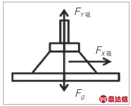 端拾器真空吸盘的形状和大小主要由所布置区域的产品形状决定。吸盘的数量则会根据产品的重量、生产节拍和吸盘的规格等因素进行综合选取。在端拾器工作的过程中,当端拾器水平放置,拾取零部件并垂直方向运动时(图4),吸盘所需的吸附力大小为:FY吸=m(g+a)S。当端拾器水平放置,拾取零部件并水平方向运动时(图5),吸盘吸取冲压产品所需的吸附力为:Fx吸=m(g+a/μ)S。式中,m为零件的质量(kg);g为 重 力 加 速 度(9.8 m/s2); a为零件在垂直轴方向的加速度 (m/s2);μ为摩擦因数,通常情况下金属表面的摩擦因数取0.5;S为安全系数,一般取1.5,若在抓取或转移过程中存在翻转或旋转,建议取2.0及以上。