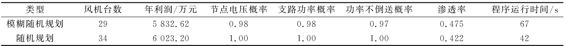 由表3可知,考虑风机出力的模糊性之后,配电网年利润下降了3.16%,这是由于k和c参数的模糊性,导致风机出力也具有模糊不确定性,从而使得静态安全指标满足机会测度约束的概率降低,制约了规划结果的优化,导致年利润下降。另一方面,尽管风机配置台数下降了,风电渗透率提高了12.56%,这是由于考虑模糊性后模拟的风机出力大于随机模拟风机出力。考虑风速的模糊性进行规划,尽管在经济性上比随机规划略差一筹,但其风机输出功率更切合实际,确保了WTG配置方案是真实可靠的。