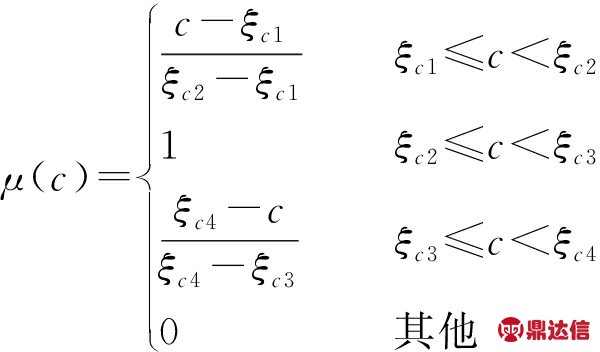 风速不仅受地理位置、气温、季节等因素的影响而具有随机性,同时由于风速历史统计数据的不齐全,难以获取认知意义上准确的参数而具有模糊性。本文采用已有文献提出的具有通用性的风速模糊不确定模型[26-27]来描述风速模糊性,将Weibull分布中的尺度参数c用梯形模糊变量ξc={ξc1,ξc2,ξc3,ξc4}表示,形状参数k用三角模糊变量ξk={ξk1,ξk2,ξk3}表示,两者的隶属度函数分别如下所示: