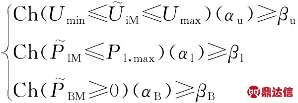 分别为节点电压、支路功率和变电站注入配电网功率的模糊随机变量;Pr(·)为概率测度;Ch(·)(α)为随机事件的α机会;Cr为机会测度;αu,αl,αB为机会测度置信水平;βu,βl,βB为概率测度的置信水平;θ为功角;Θ为功角集合;sup(·)表示取上限。