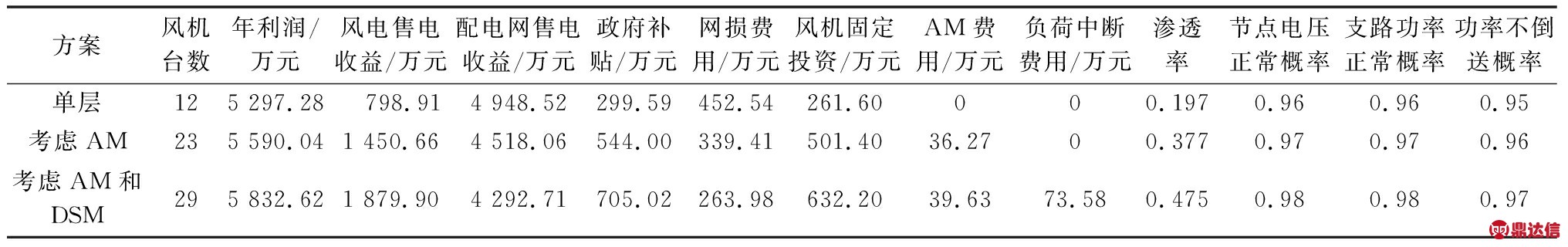 由表1可知,在同一机会测度置信水平下,考虑AM措施规划相比单层规划,可以看出不考虑任何调节措施情况下,配电网消纳高比例风电有一定的困难,风电渗透率只有19.7%,而在考虑AM管理措施之后,风机配置增加11台,配电网消纳的风电比例得到极大提升,达到了37.7%。同时网络运行也得到了优化,网损费用降低了25.0%,风电售电收益增加了81.58%,年利润提升了5.53%。这是由于当负荷功率较低时,适当削减WTG出力能够防止风机接入点电压过高以及潮流倒送,从而可以配置更多的风机,风电渗透率相应得到提升,系统安全性同样得到提高。