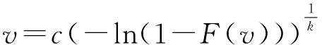 基于式(1)至式(3),在k和c的置信区间里模拟出96组k和c值,k和c分别按大小排序后进行匹配,保证每组k<c,此时每组k和c值依次对应于一个确定性场景。经式(3)逆变换后,可得每个场景对应风速: