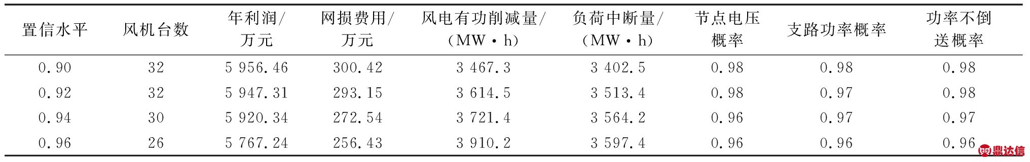 由表2可知,随着静态安全指标置信水平由0.96下降到0.90,配电网年利润逐步上升并接近饱和,网损费用呈现上升趋势,DG有功削减量和负荷中断量呈现下降的趋势。这是由于置信水平降低之后,会有更多符合静态安全指标约束的WTG配置情况出现,较优的WTG情况数变多,最大年利润升高,然而在置信水平低到一定程度时,提高风机配置数量会启动管理措施,启动管理措施后的收益并不高于管理成本,因此总利润渐渐趋近一个上限值;另外,静态安全指标要求提高之后,网络运行更安全稳定,网损会随之下降;同时,要达到更高的静态安全指标置信水平,需要加大管理措施的力度,因此风电有功削减量和负荷中断量会相应增加。