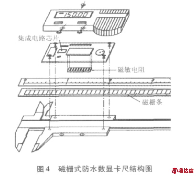 图4为应用磁栅式位移传感器制作的防水数显卡尺的结构图。图中磁栅条固定在不锈钢尺胚上,外敷刻度膜,构成主尺部分,磁敏电阻固定在线路板上,通过集成电路芯片及其他电路芯片,完成模数转换、数字处理,并将最终的位移量显示到液晶屏上。