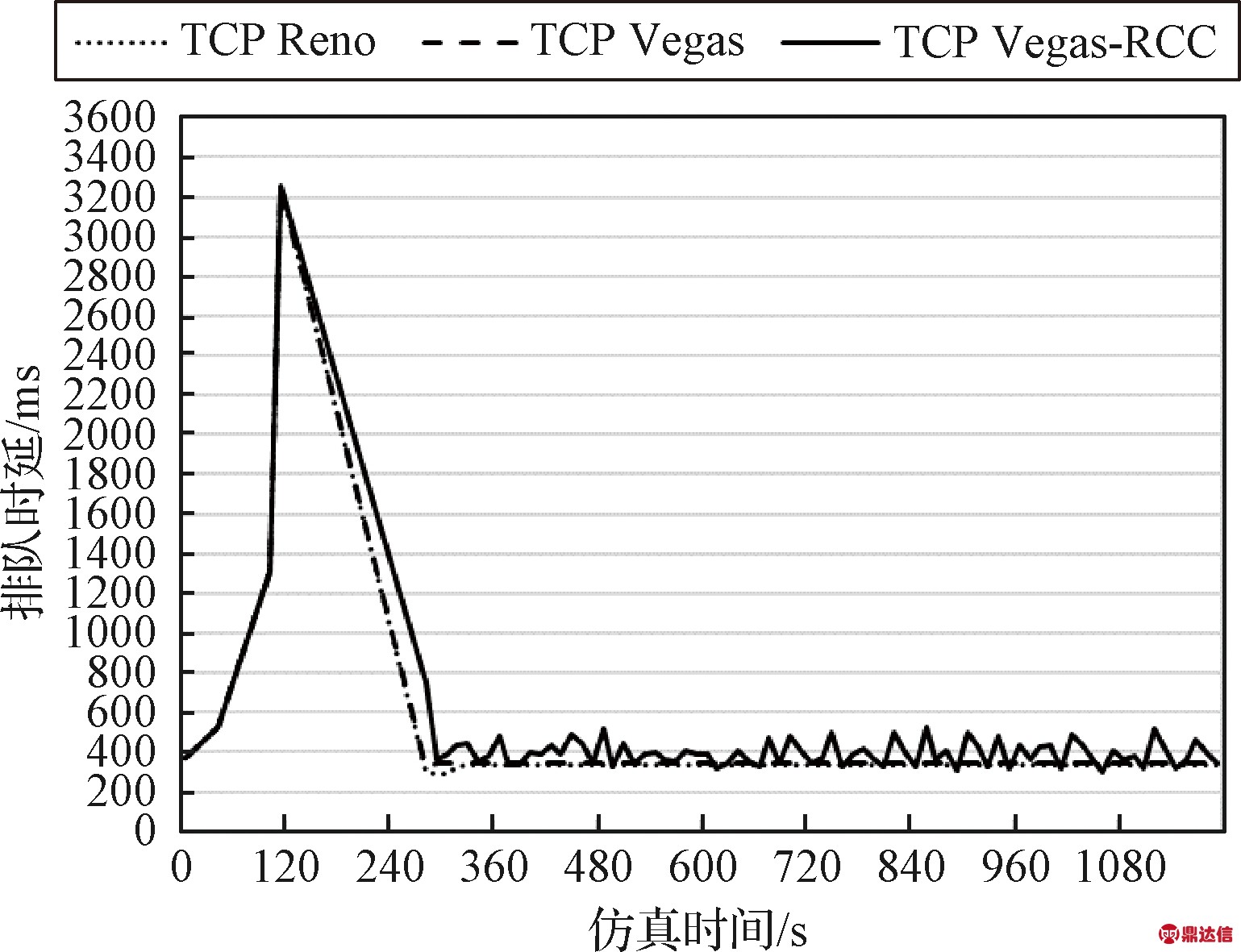 为了更清楚地观察和分析反向链路排队时延对TCP Vegas-RCC性能的影响,将反向瓶颈链路的缓存设置一个较大的值(6个确认分组的大小),用以缓存未及时转发的确认分组,只让反向链路产生确认分组的排队现象,以避免由于反向瓶颈链路缓存不足所引起的确认分组丢失情况对仿真结果的影响。