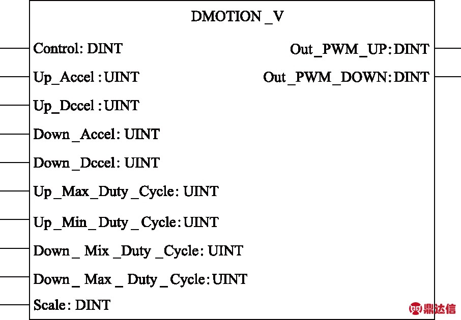 DMotion_V模块函数主要用于控制比例阀,有两路PWM输出,一般为正反向输出,控制信号范围-10000~10000,当控制信号在0~10000,Out_PWM_UP 输出,值 0~10000;当控制信号在0~-10000,Out_PWM_DOWN输出,值 0~-10000。由参数控制最大最小输出电流范围。DMotion_V功能块函数如图4所示。
