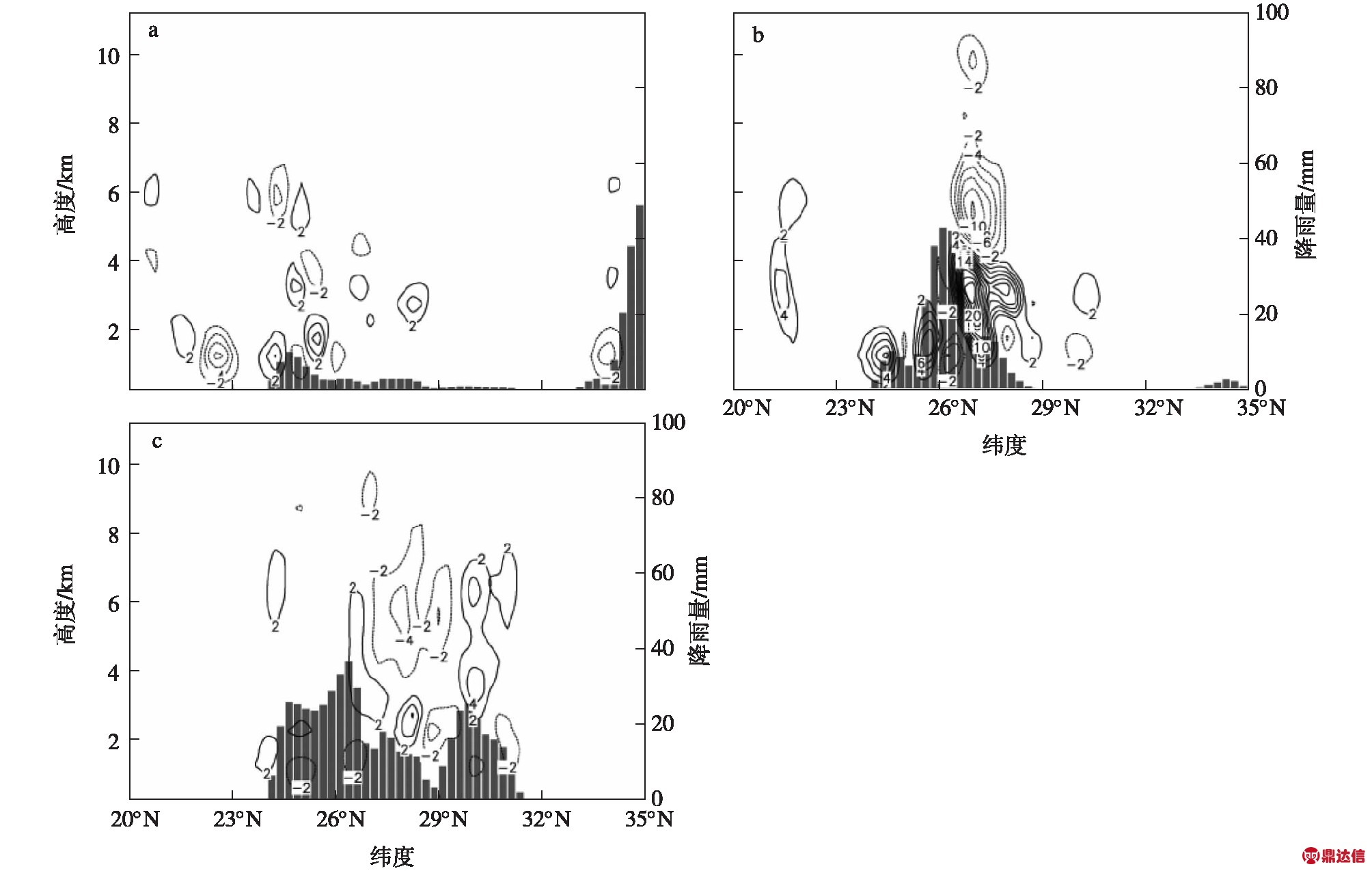 图2 2009年8月7日18时(a),8日18时(b)和9日18时(c)波作用密度A(等值线,10-6 K·m-1·s-1)沿着119°E的经向-垂直剖面的分布(灰色直方图代表观测的6 h累积降水,单位:mm)(冉令坤等,2013)