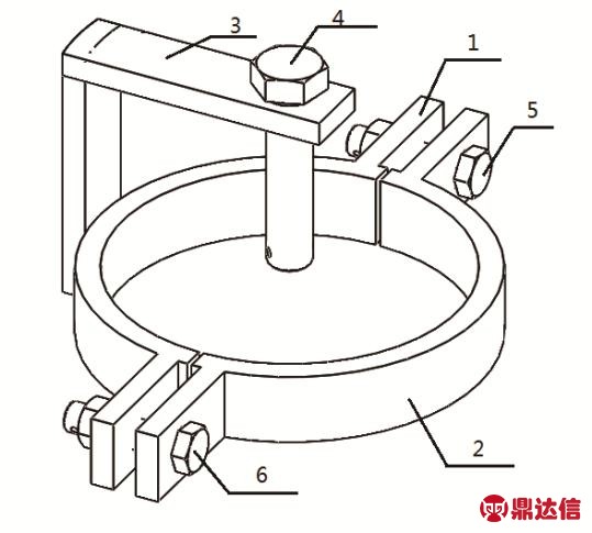 如图2所示,一种用于核电站自密封止回阀拆卸时防跑水装置,1.卡环,2. 卡环,3. 限位螺栓支撑臂,4. 限位顶紧螺栓,5. 紧固螺栓,6. 紧固螺栓。