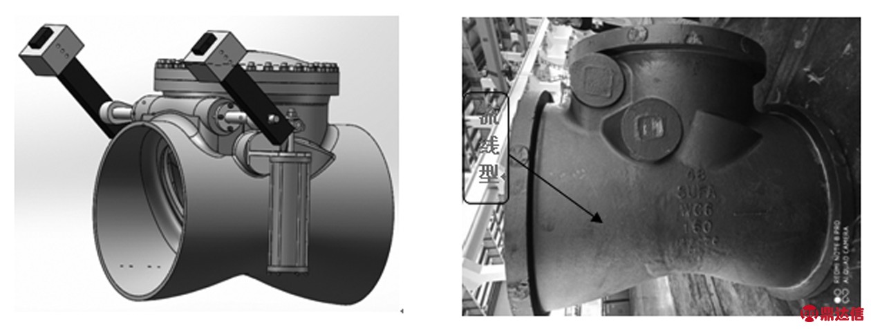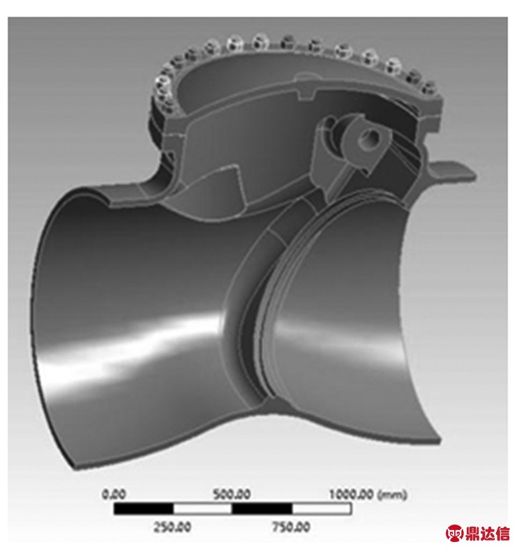 当前分析的常规岛大口径抽汽止回阀是目前核电中口径最大,也是最具代表性的规格。设计参数如表1所列。总体上采用最先进的低流阻流线型旋启式结构,如图1所示。其阀体呈扁“凸”型结构,主要目的是降低流体阻力,提高阀瓣开启力,如图2所示。当然采用了这种结构后,会造成常规强度计算不全面、不精准,所以必须采用有限元分析法确保产品有足够的强度。