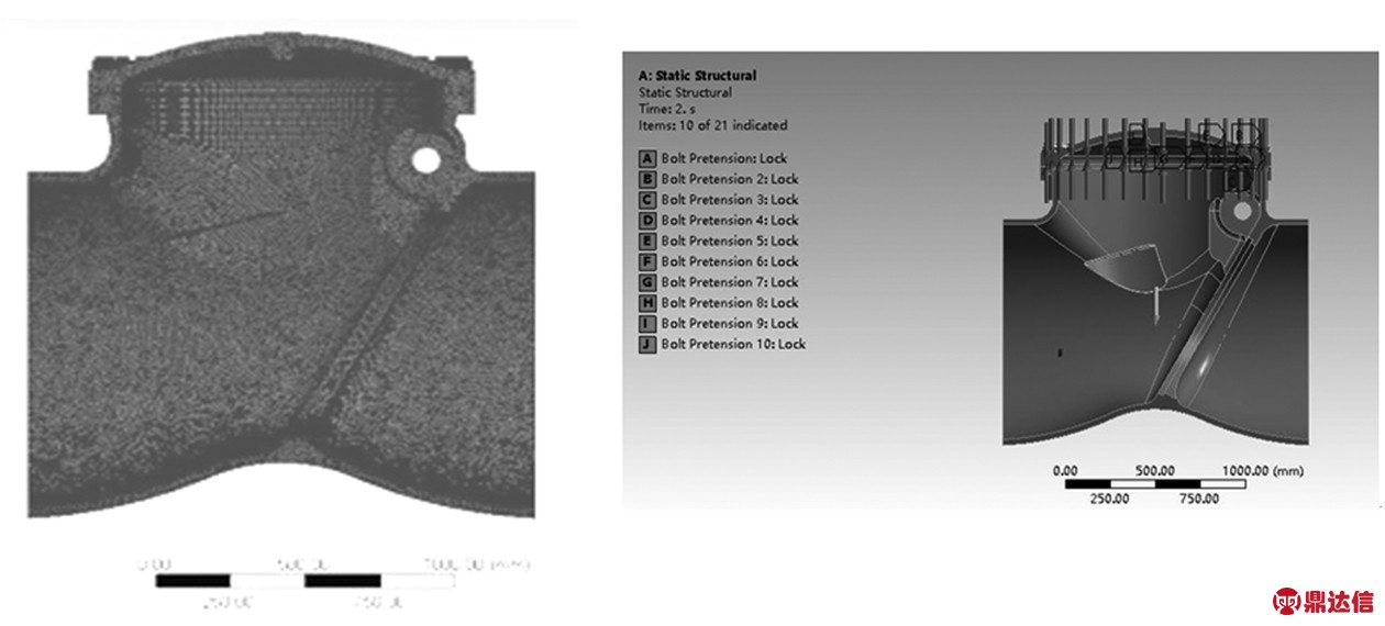 分析前对该模型做以下几点说明:① 该模型所有尺寸均与施工图纸一致;② 为简化计算,不考虑中法兰螺柱螺母连接结构螺纹特征;③ 为缩减计算规模,考虑到阀门的对称性,取阀门的1/2建模;④ 阀体、阀盖材料均为ASTM A216 WCB,常温下密度为7.85 g/cm3,弹性模量2×105 MPa,泊松比为0.3;螺柱和螺母材料分别为ASTM A193 B7/ASTM 194 2H,弹性模量2.3×105 MPa,泊松比为0.3。