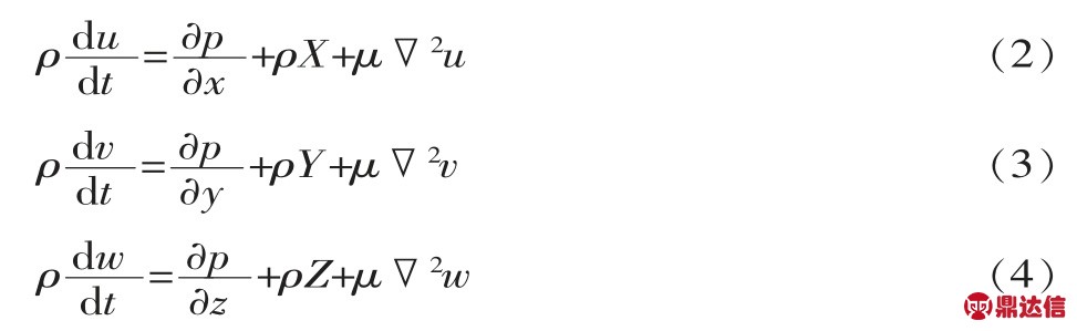 式中:▽2 为拉普拉斯算子;ρ 为流体密度;p 为压力;u、v、w 为流体在t 时刻(x,y,z)处的速度分量;X、Y、Z 为外力的分量;μ 为动力黏度。