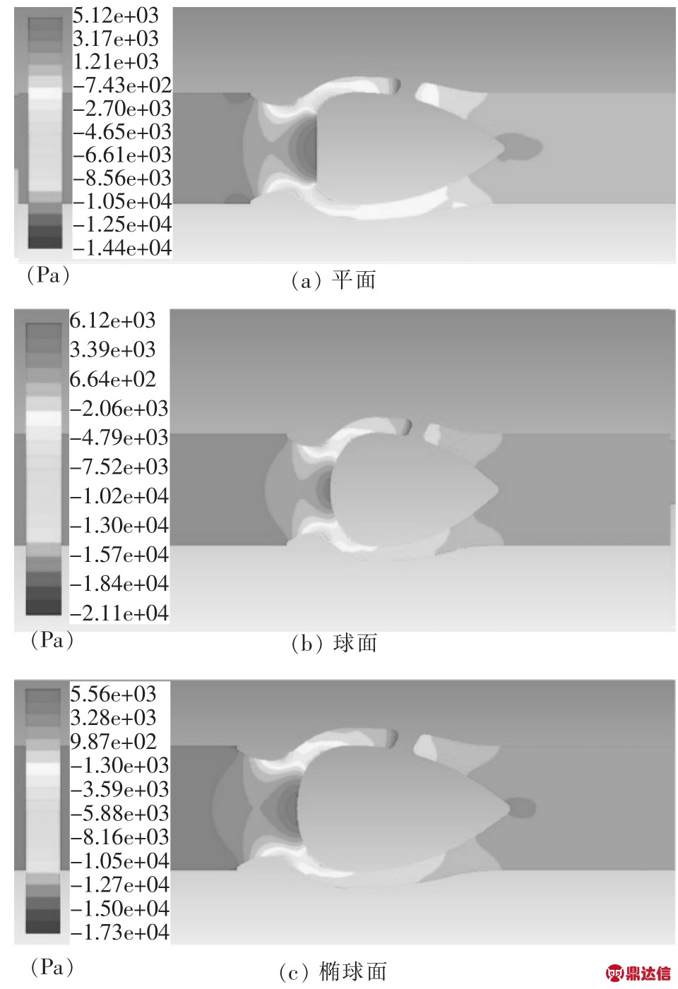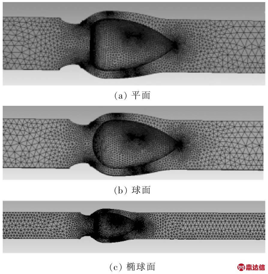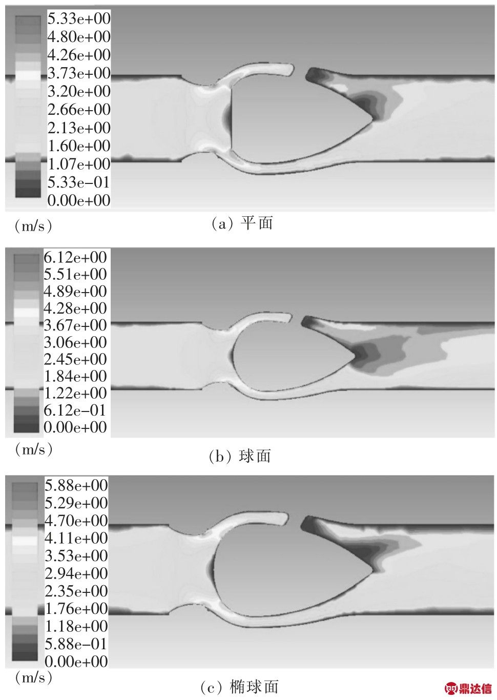 计算得平面阀瓣结构阀门的流阻因数为1.196,球面阀瓣结构阀门的流阻因数为1.137,椭球面阀瓣结构阀门的流阻因数为1.129。各结构速度云图如图6 所示,对比可知,椭球面阀瓣在阀瓣前产生涡流的面域最小,流阻因数最小,在三种表面形状中最优。