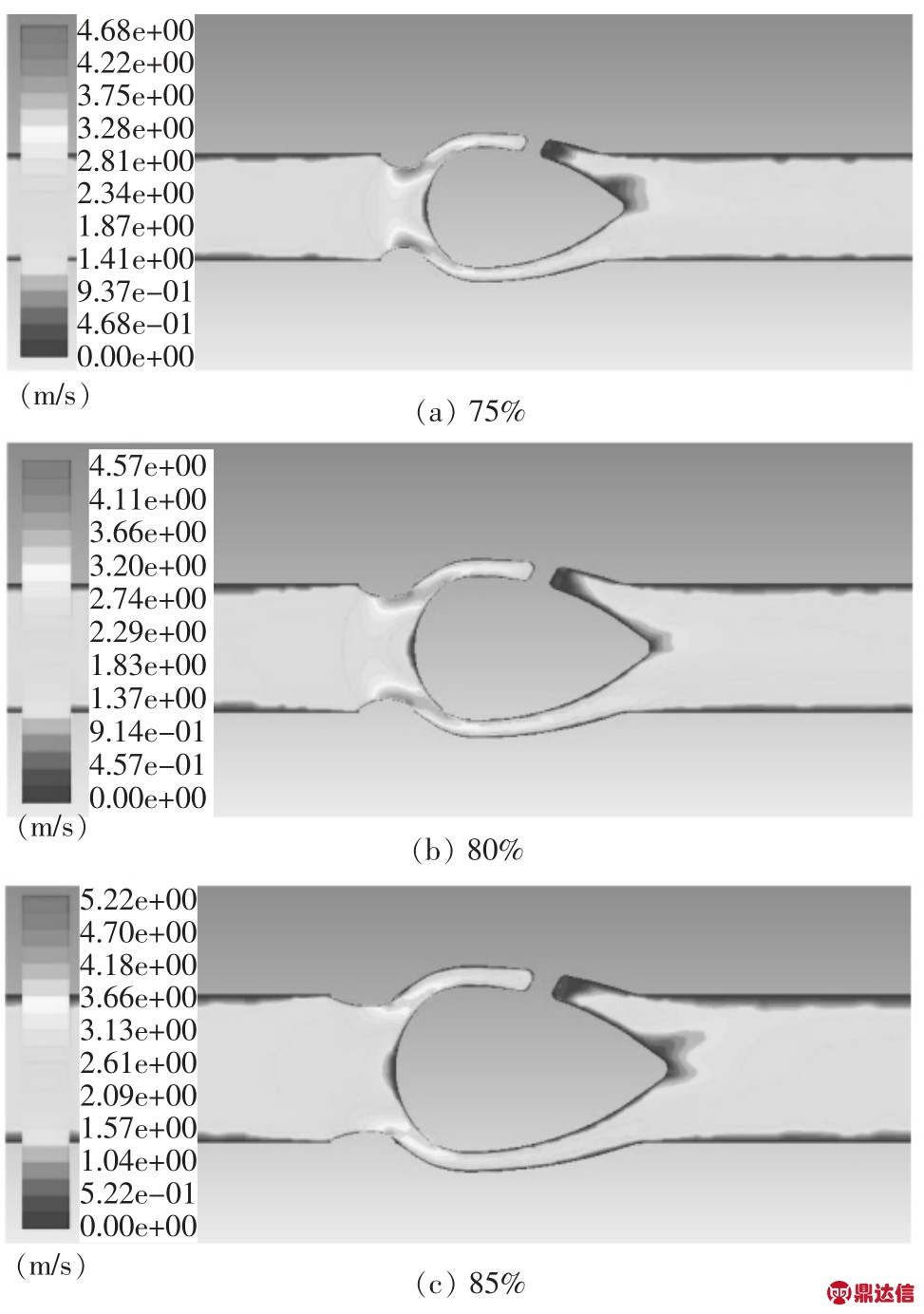图9 不同阀瓣喉部收缩因数全开时速度云图