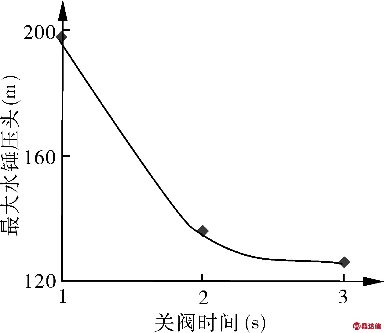 工况的目的是分析梭式止回阀在不同关阀时间下管道系统的水锤压头变化情况,得到关阀时间对管路系统水锤压头的影响。