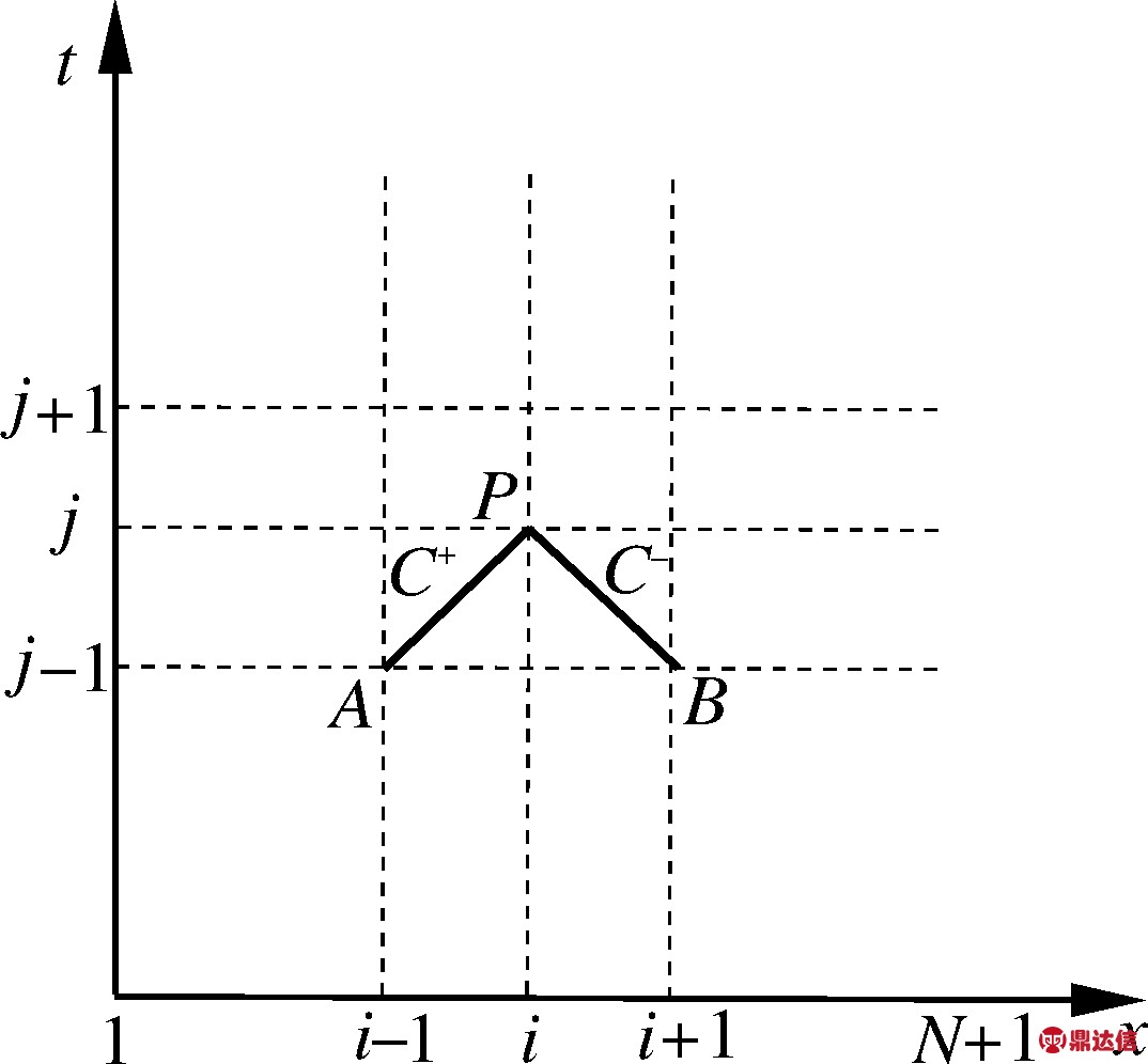 有关水锤波的研究有着悠久历史,形成了多种计算方法[4],常用的有特征线法、有限差分法、有限元法和有限体积法[29~32],其中数值计算方法中的特征线法有其许多优点,已大量地运用于编程计算分析[1,33]。因此本文也按照特征线法对偏微分方程(式(1)和式(2))进行求解。为了方便编程分析计算,再根据图2差分网格写成差分形式,得到任意P点的压头和流量的计算式: