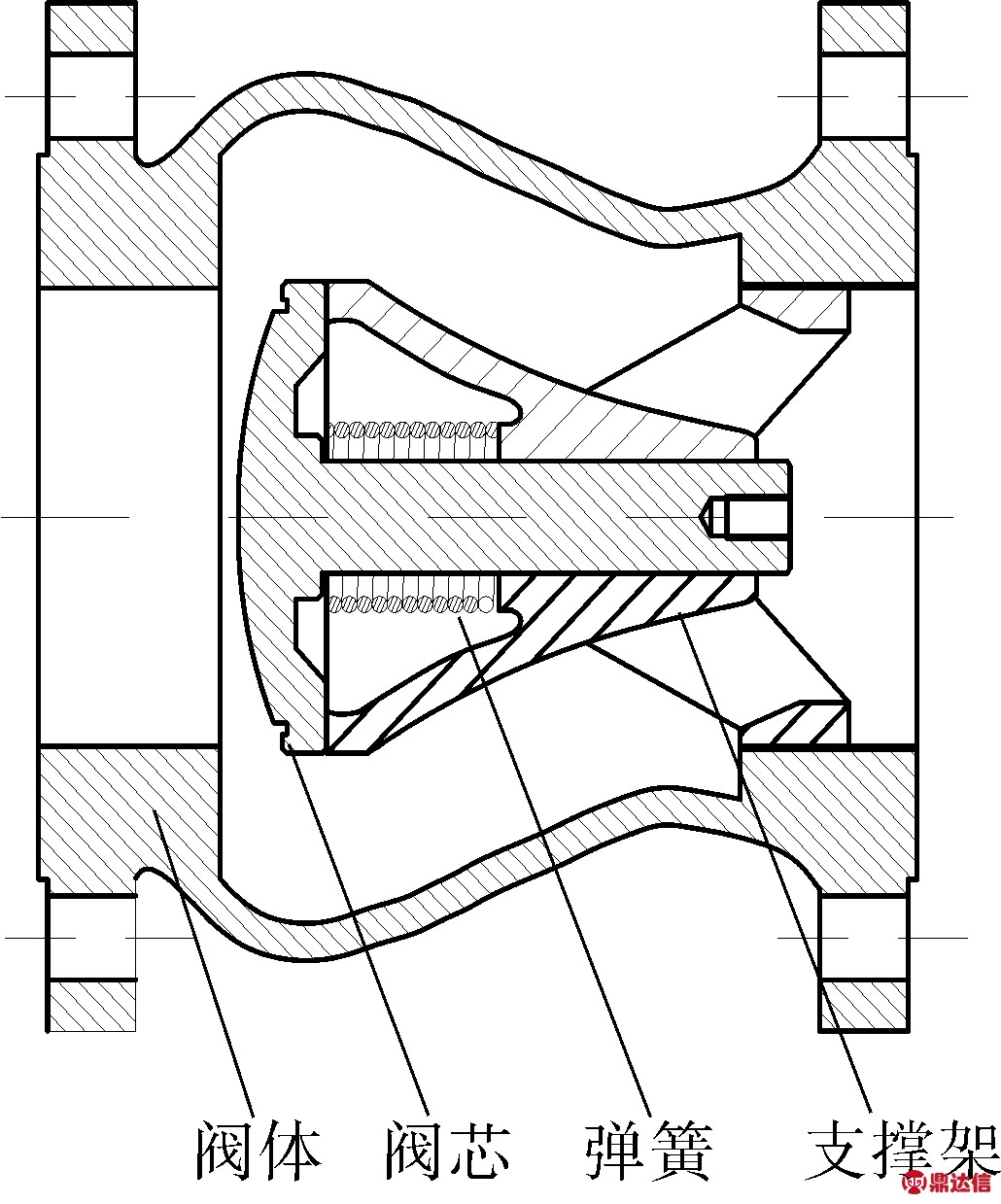 梭式止回阀主要由阀体、阀瓣、弹簧以及支撑架组成,阀瓣采用的是双重密封,除端面密封外,周向还有“O”型密封,则可以克服一般止回阀密封效果差的缺点[26],其具体结构如图1所示。