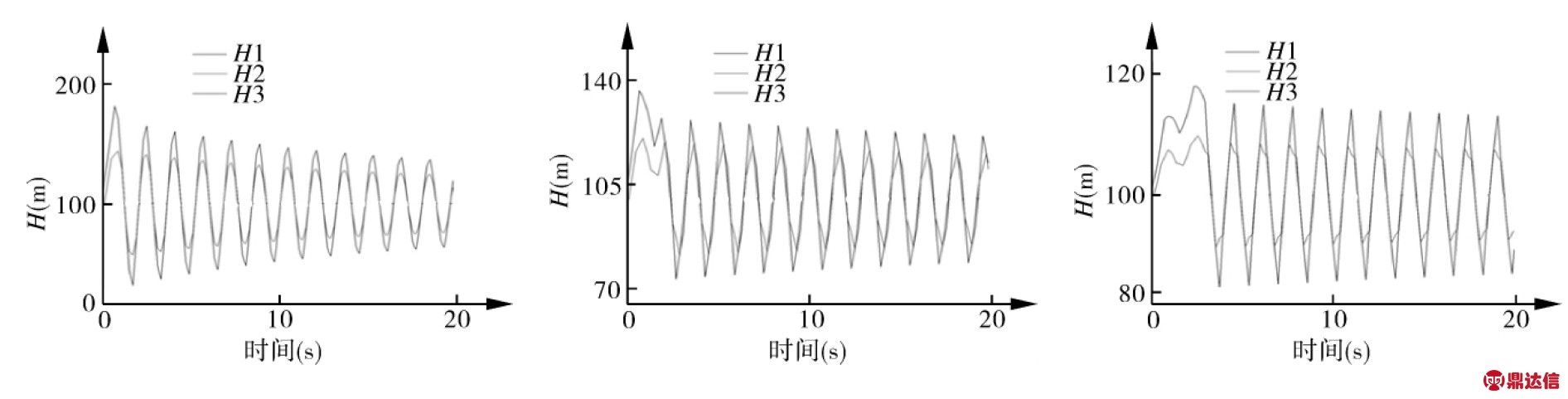 相关参数取值如下:水锤波速为1200m/s,管道直径为0.05m,水库端水位为100m,管道的摩阻系数为0.0202,计算时长为20s,每步时为0.1s,管路的长度为480m,流体流速为1.2m/s,关阀时间为1s、2s和3s(均是匀速直线关阀),截面为水库端截面(H1)、管道中心点截面(H2)和梭式止回阀进口截面(H3)。