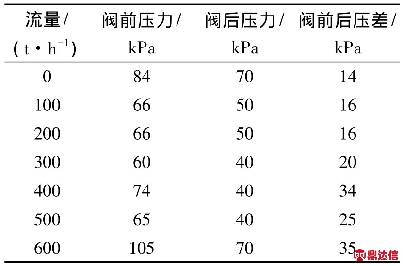 为得到流量和压差的关系,选取了流量分别为0、100、200、300、400、500、600 t/h 的节点分析。选取节点上阀前、阀后压力,计算得出前后压差,得到表2[11]。