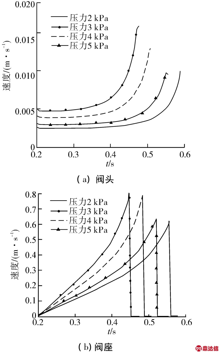 图7为阀头、阀座速度变化曲线,由图可知,阀头、阀座速度与压差和开度有关,随压差增大而增大,随开度减小而增大。
