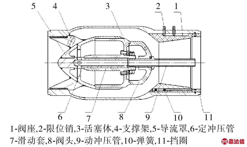 当流体逆流关闭时,冲压腔内流体速度很低,压力近似于滞止压力,所以处于高压区,而阀头前端和冲压腔外侧流体速度较快,处于低压区,且活塞直径大于阀座直径,所以作用于阀头上的合力指向关闭方向,阀门关闭。阀头的运动方向与流体的流动方向相反。另外,阀座是可活动的,在流体节流作用下,可加速阀门的关闭。