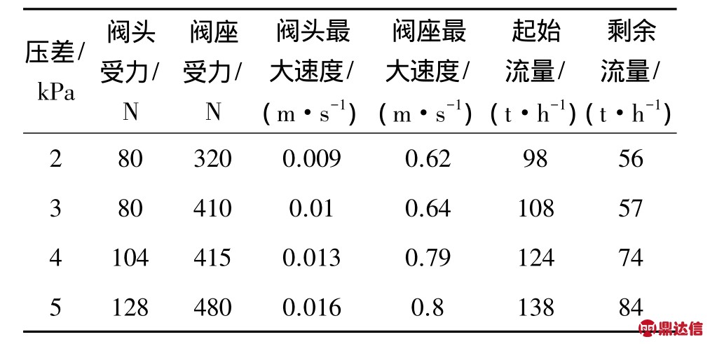 4种压差下阀头、阀座受力,阀头、阀座的最大速度,起始流量及剩余流量的数值如表1所示。