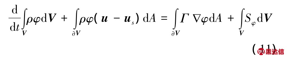式中:ρ为液体的密度,kg/m3;u为液体的速度矢量;us为动网格的网格变形速度;Γ为扩散系数;A为控制体表面积;Sφ为通量的源项φ;∂V为控制体V的边界。