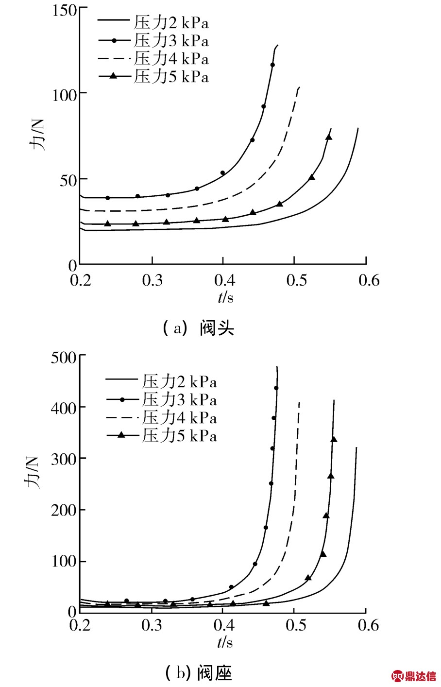 1)阀座的运动对于阀头受力有很大影响。随着阀座的关闭运动,阀头所受的瞬态力逐步增大,阀门的关闭会越来越快,增加了阀门关闭的可靠性。