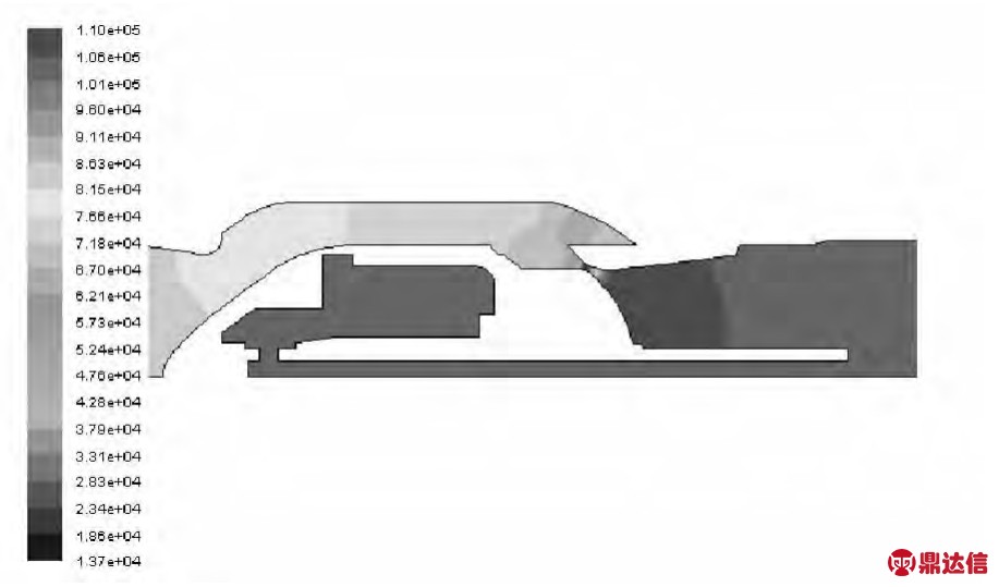 如图4为对冲式止回阀关闭时的静压云图,由图可以看出,流体流动方向为逆流,止回阀关闭以后,压力腔、冲压管内部以及右侧管道为高压区,左侧管道为低压区,如此可保证阀门处于关闭状态,直到流体向右反向流动时阀门被打开。如果流体运动方向为顺流,则冲压管内部与压力腔内部为低压区,靠活塞与阀头面积之差所产生的力使得阀头向左侧运动。