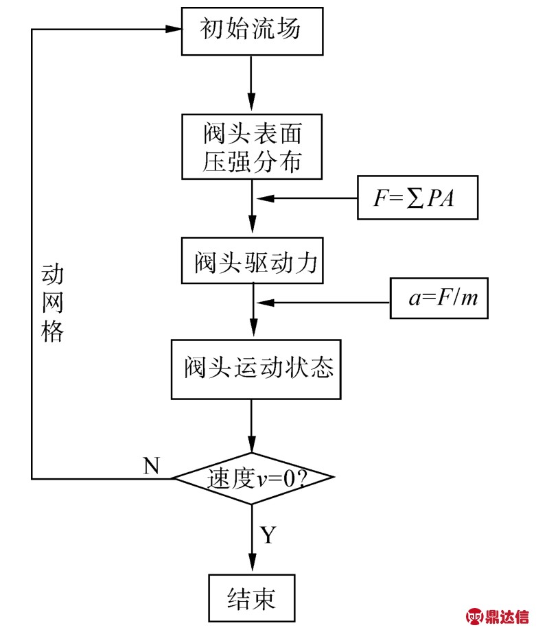阀头上的压差取决于阀内流场的压力分布,该压差产生阀头赖以完成启闭动作的驱动力,而阀头的运动直接影响阀内流场,流场的变化又反过来影响阀内流场的分布。如图3所示,是利用CFD技术模拟对冲式止回阀启闭动态过程的程序流程图,对冲式止回阀的动态过程是一个耦合的闭环过程,需用数值计算的方法求解。