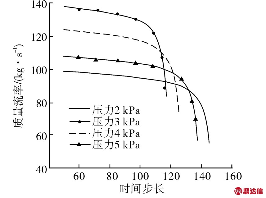 流量特性是阀门重要性能指标,图5给出了对冲式止回阀在关闭过程中,不同压差下阀门关闭时入口流量的数值模拟结果。