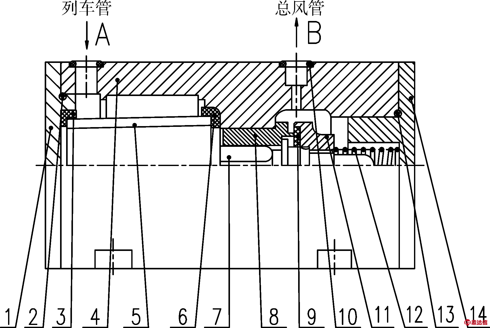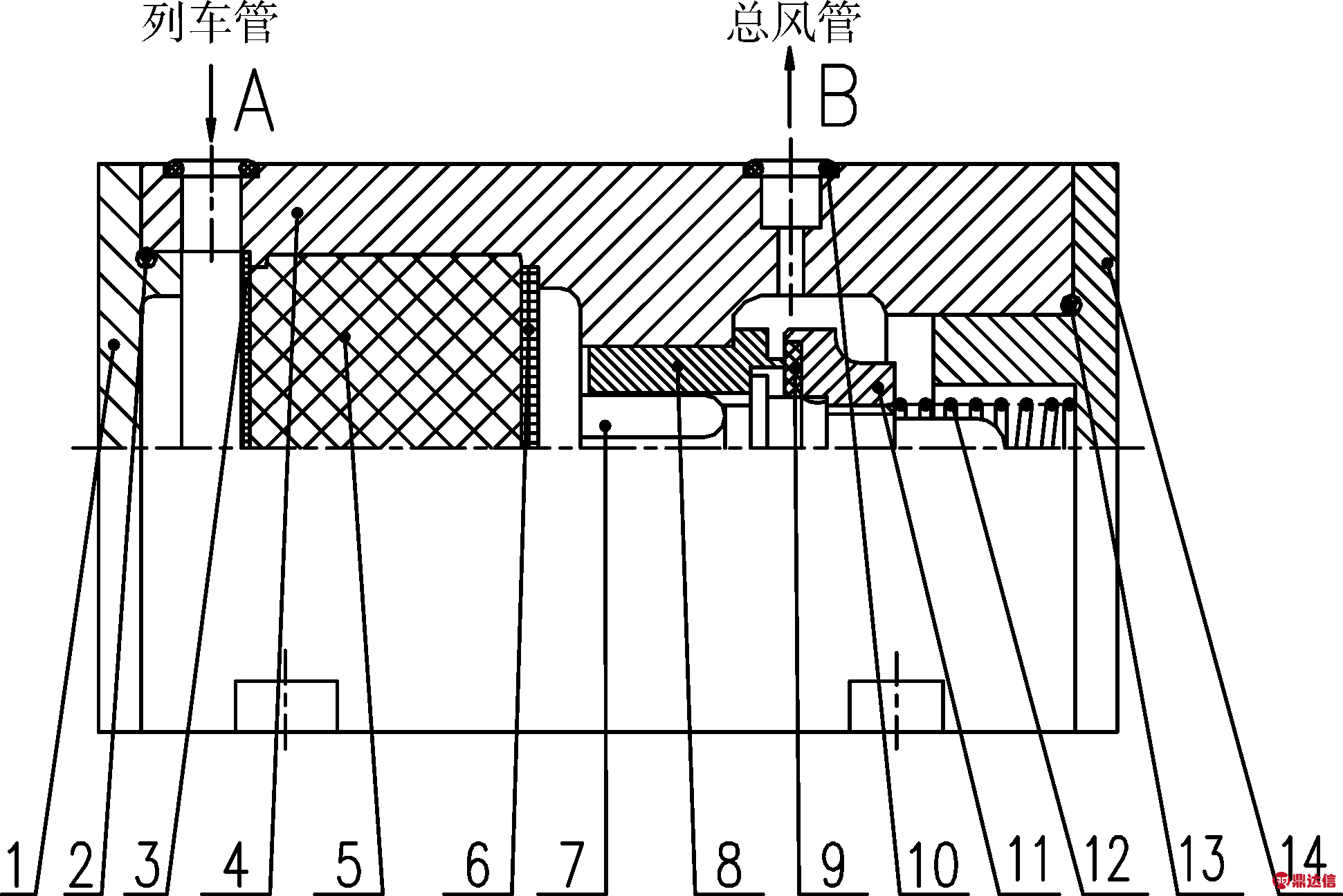列车管的压缩空气,从阀的A口进入阀体内,首先经过滤尘网、填料、滤尘网,除去压缩空气中夹杂的机械杂物,推动阀芯向右移动,打开阀口,连通总风管,最后充入总风缸中。当列车管压力由于减压而下降时,弹簧可下压阀芯装置,继而关闭阀口,切断总风缸与列车管之间的通路,防止总风缸的压缩空气向列车管逆流。