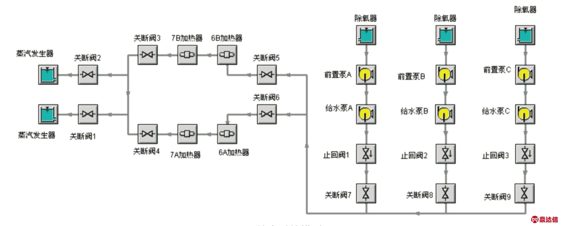 本文以某百万MW 级核电站工程实例为基础,利用AFT impulse 软件,建立核电站二回路给水系统模型,介绍止回阀对水锤压力的影响,图1是模型简化图。